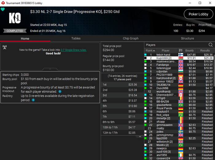 В вечернем бадуги словил баббл финалки, а в лоуболл занял 2-ое. Тут сильно переоценил умственные способности оппонента, когда в хедз-апе, выставившись на префлопе в огромном банке за победу, он сыграл СТЕНД с ДАМОЙ, я был вынужден обменять готовую руку с десяткой. С моей стороны это правильное решение, после его стенда в огромном банке, но на шоудауне я конечно удивился... Я словил пару, поэтому такое глупое 2-ое место получилось. В любом случае, качеством своей вчерашней игры доволен на 100%.