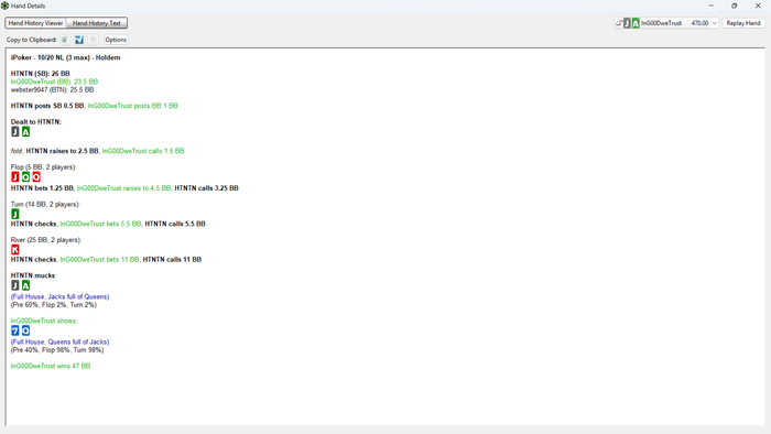 До конца думал скинуть ривер, но в итоге все равно решил пробить и ожидаемо проиграл. Сейчас мне кажется, что в такой ранаут нужно всегда пасовать нижний фулл хаус. По солверу это колл, но в реальной игре в такой ранаут все блефы получили шдв и на тройках думаю никто не будет запихивать стрит или флэш в блеф. Что думаете, есть тут колл против среднего рега?