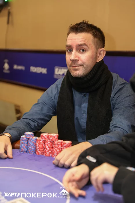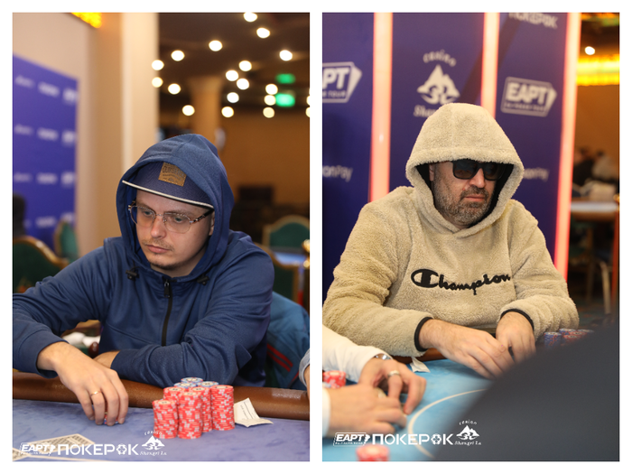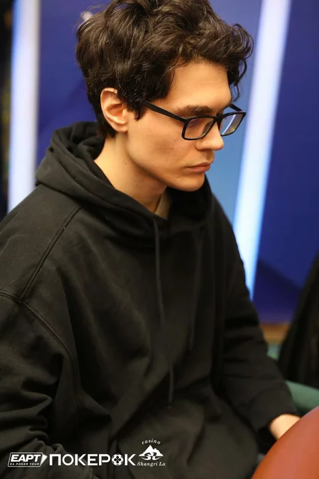 Чиплидер Evgenii Ilin открылся с катоффа с , Aliaksandr Tsikhanovich (425,000) с самым коротким стеком запушил с баттона, Ильин доставил.