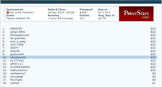 А такое сюда можно? Единственный пока мой (не СНГшный) "занос": 1st tie for a $22 ticket to SCOOP. Интересно, что шел 3-м когда сформировалась группа призеров, но ОПР меня "10-м местом" удостоил