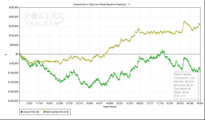 в снг всё решает дистанция, я играю фифти, и там дисперсия ниже чем в обычных снг,играю их в хороший плюс, но 500 турниров в ноль очень даже легко и нередко может происходить =) если ты играешь по 20 турниров в день, то получается ты можешь играть почти месяц в ноль ))) думай сам =) в снг решает только дистанция ! тысячи турниров, нужно гриндить в общем парень =)