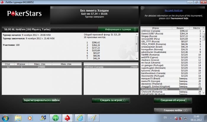Final Pot: 4,400 karasev87 shows a pair of Nines