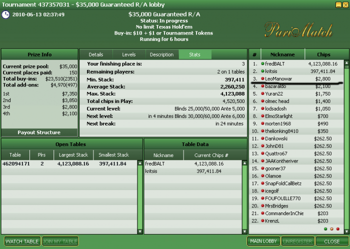 No-Limit Hold'em Tournament, 40/80 Blinds (10 handed) -