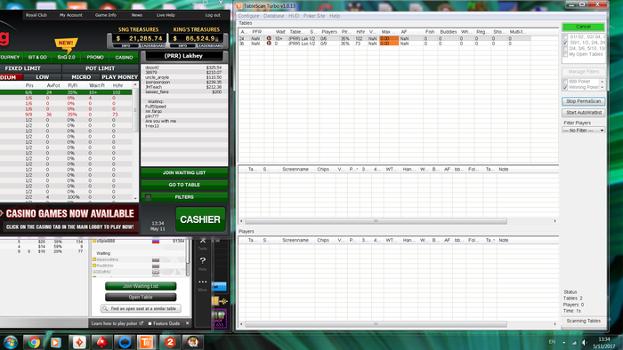 Подскажите, пожалуйста, почему ТСТ работает криво: после сканирования внизу пишет число столов и игроков, но в списке столов пусто и в вейтлисты не встает? Если пооткрывать столы, то тогда при скане они отображаются в списке, но в очередь не встает. Если в списке выбрать стол и там выбрать джойн тейбл лист, то тогда уже встает в очередь. Может проблема в окошке, которое появляется при нажатии join waiting list на PokerKing, но его вроде не отключить. На ПС все четко работало, вроде по аналогии настроил. Заранее спасибо