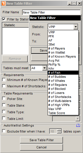 К чему я всё это спрашивал. Главный вопрос в том, можно ли сделать так, чтобы открывались столы, где, например сидит один фиш с ВПИП 50+ или два фиша с ВПИП 40+ и фолдом на кбет меньше 45? Судя по настройкам, можно сделать только так, что будут открываться все столы, где сидит хотябы один игрок, попадающий под эти фильтры (это если задавать в меню "Configure -> List Filters (вкладка Players List)". Или же можно выбрать по кол-ву фишей за столом, которые задаются в настройках фишей. Но тогда кол-во фишей будет задано одинаковое для всех видов. А я бы хотел сделать, чтобы открывались столы с одним фишом с ВПИП 50 или минимум с двумя фишами с ВПИП 40+ и фолдом на кбет от 0 до 45. Так можно задать программе? Если да, то как? Сам я что-то не могу понять(((