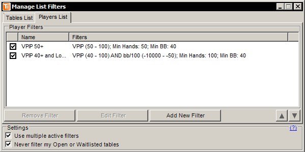 2) И правильно ли я понимаю, что в меню "Configure -> List Filters (вкладка Players List)" можно настроить критерии поиска по игрокам, сидящим за столом? Если да, то тогда можно выставить все критерии поиска игроков в этом меню. Тогда пропадает актуальность данного меню: