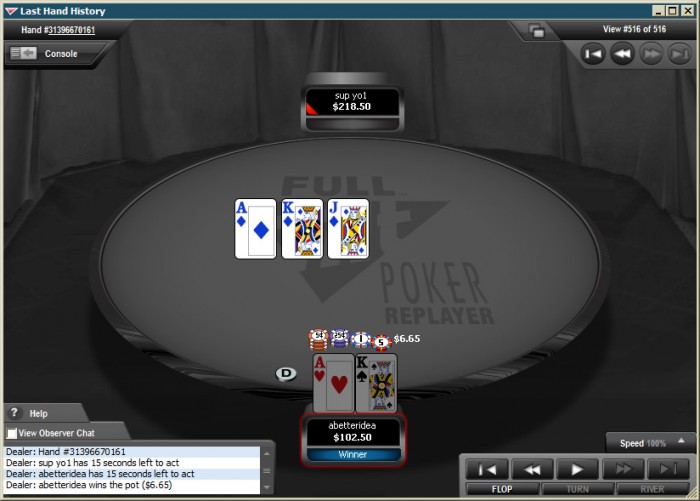 Ну и ладно, я особой радости от этого матча тоже не испытывал ) А вот у него сегодня точно хороший день, вряд ли мы еще долго будем видеть его на нл50 - из шести столов 5 уже было на нл100.