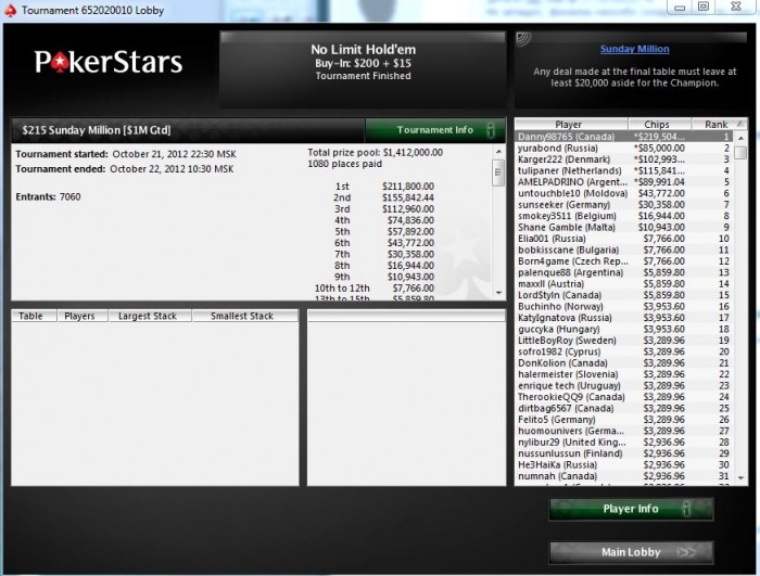 Тот кто выиграл имел почти половину чипов, и по дележке получал 191к. Он отдал 2к yurabondу. После дележки играли на первое за 20к и чипак стандартно занес турнир. Получил больше чем за первое)))