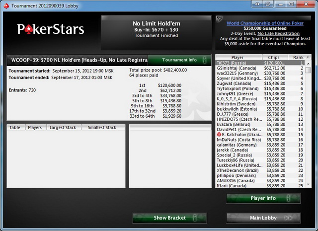 Poker Stars $2000+$100 No Limit Hold'em Tournament - t60/t120 Blinds + t15 - 9 players