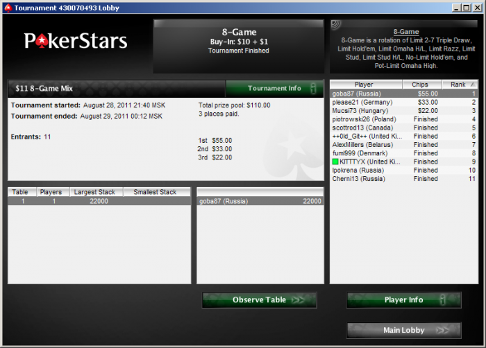 На предфиналке два моих соседа по столу прочувствовали что такое НЛХ МТТ-про. Думаю, им хотелось плакать и кричать "когда же этот безлимитный уже закончится?" Отовнил их по полной, а затем добил в омаху-хай)) На финалку вышел со стеком 10К при 3К у ближайшего преследователя)) Дальше уже дело техники. Правда, в хэдс-апе парень в какой-то момент почти догнал меня по фишкам. Но скилл решил -- хироколл на полстека в НЛ поставил красивую точку в упорном противостоянии))