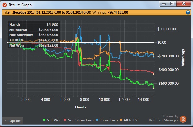 По графику у тебя недобор 400К фишек за 15К рук, в принципе по этим данным трудно что-то сказать, лучше бы выложил картинку в ББ. Ну и по идее синяя линия у тебя довольно-таки низко находится