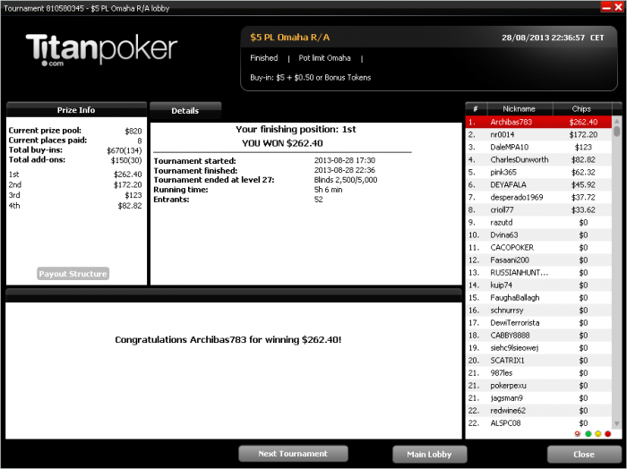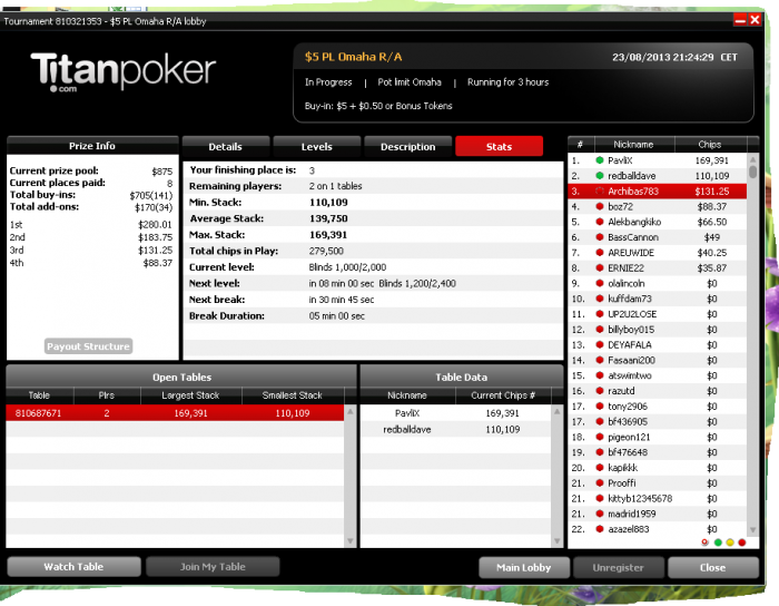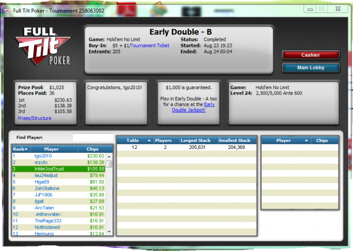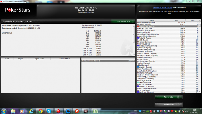 Сегодня благодаря 2 заносом пройден первый этап сотрудничества!!! 1000$ профита сделано за 39 дней. На новом уровне решили играть омаху хай-лоу до 16.5, простую омаху до 11, а также холдем до 5.5 это, что касается МТТ. Также продолжу осваивать СНГ и катать сателлиты. Возможно сыграю 1-2 вкупа и конечно же впереди минифтопсы.