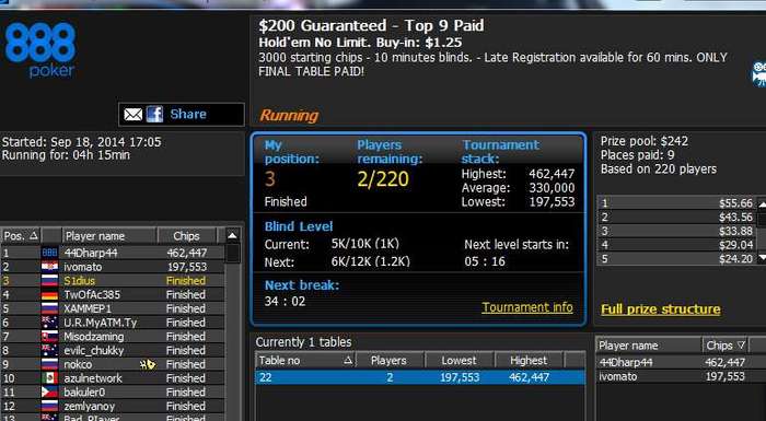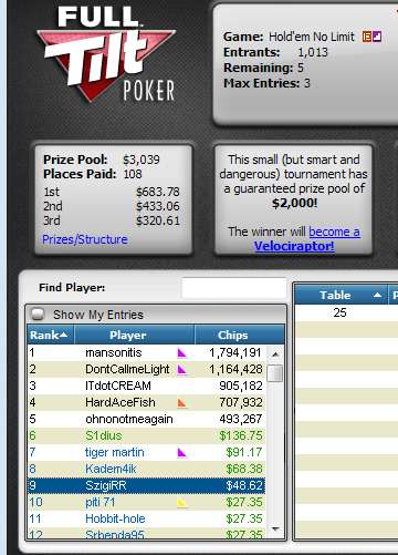 PokerStars No-Limit Hold'em Tourney, Big Blind is $250 (9 handed)