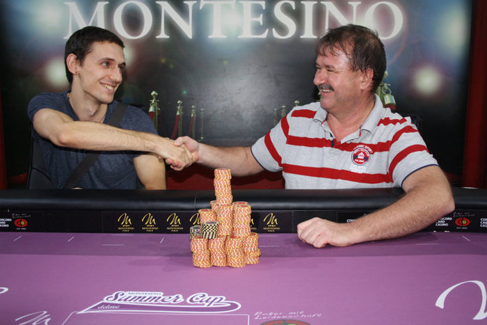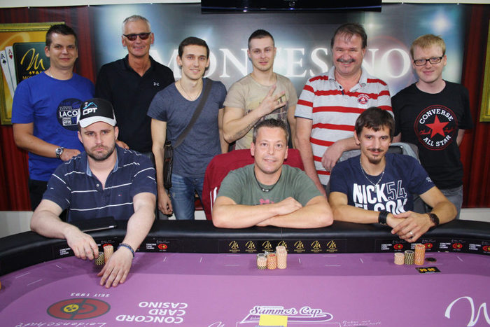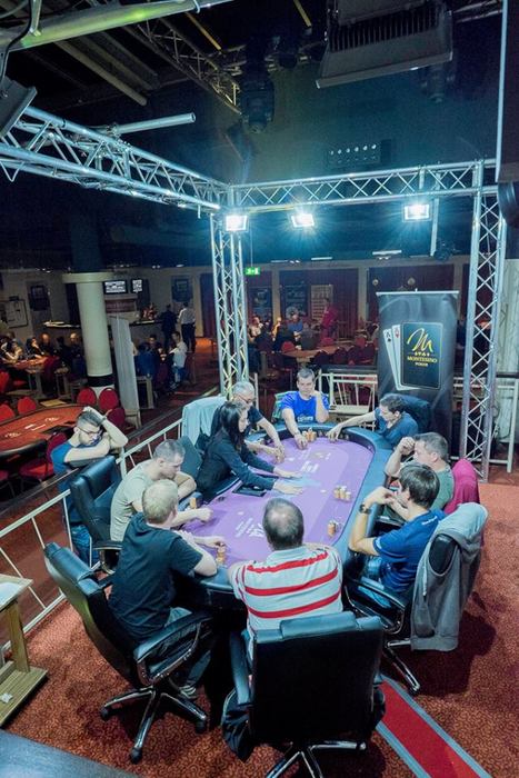 А теперь, немного о моем предпоследнем оффлайн турнире. Выбрался на турнир за 100 евро, турнир собрал за два входных дня около 500 человек. Первый день складывался довольно не плохо, но под конец дня получилось немного слиться и в ИТМ я попал чуть меньше, чем с средним стеком. Второй день выдался для меня не самым удачным, но с другой стороны я выигрывал все свои Основные(за все фишки)выставления, хоть не разу не был снизу...но монеток я натащил, не мало. Вообще забегая на перед, второй день для меня длился 13 часов и был очень сложным. В связи с тем, что на днях я приболел, состояние в средине дня было у меня не самым лучшим, но удалось умыться, выпить лекарства и со временем мне стало лучше. Финальный стол собрался довольно легкий, всего с парой нормальных игроков, все остальное фиши. Весь второй день турнира транслировался в онлайн трансляции, с открытыми картами. По этому на финалке за меня болело пол Херсона и друзья с Вены. Финалка была с полнейшим card-dead...но тем не менее удалось взять второе место, благодаря хорошей игре в алл-инах. Основные раздачи были выиграны 55 > 44, A9o > 56o , QJs > 106o (последние две, я колировал пуш с СБ на 11-12бб). Довольно не обычно, но других алл-инов на все фишки, вроде и не было. Вообще, структура на финалке была как обычно, плохая в такого рода турнирах, средний стек все время был в районе 13-14бб. В хед-зап вышел против дедушки фиша, у него стек был в 5 раз больше моего. И при первом же выставлении мои А3 не устояли против его Q8s. Ривер 8, помешал мне снова занять 1-ое место. Но тем не менее, результату я рад, так как день совсем не складывался, так как хотелось. Немного фото отчета. Финалисты: