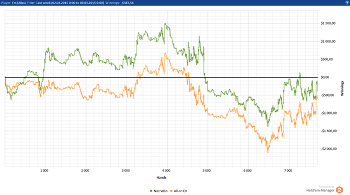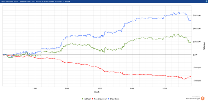 Часто делаю ставки, там где они не нужны и ч\б была бы лучшей игрой, но хочется забрать деньги здесь и сейчас. И, видимо, агрессии в каких то моментах, наоборот, не хватает. В итоге получаю ч\р, слёзы, дрожь в руках, отказываюсь фолдить, колю, колю, чекаю своё незакрывшееся дро и проигрываю 3й паре...