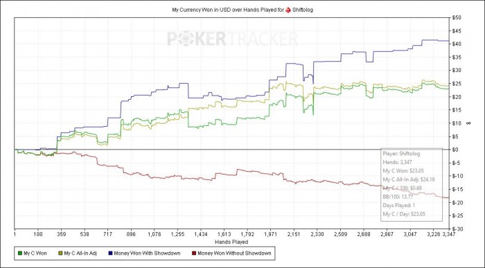 traveltyz @ 16.4.2014 Кэшевики отзовитесь, нужно посчитать правильно винрейт BB/100 $/100 BB/hour $/hour Итак у меня стоит пт3, но он считает в бигбетах, показатели: 14.91 1.49 74.52 7.43 Сыграно 8480 раздач, выграно в долларах 126.11 и здесь начинается нестыковка с кассой, т.к начал я играть имея 33 байина для нл5 то бишь 165$.Сейчас в кассе 348.75 - 22.65(эта сумма выграна в мтснг)=326.1- 165(стартовый банкролл)= 161.1 Имеем нестыковку в 161.1-126.11= 34.99$, как посчитать винрейт имея такие величины? нестыковка связана с игрой на евро столах, евро трекер не конвертирует в усд.