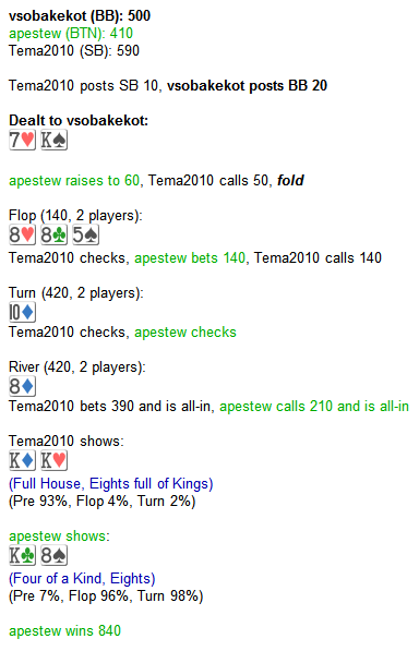 Ночью думаю глянуть финал WSOP Хотя за кого болеть непонятно. Всем желающим еще можно поучаствовать в фрирольном конкурсе Но как там расставить, хотя бы приблизительно, соперников по силе, тоже непонятно. Стол темных лошадок. Будем надеяться на красивый покер.