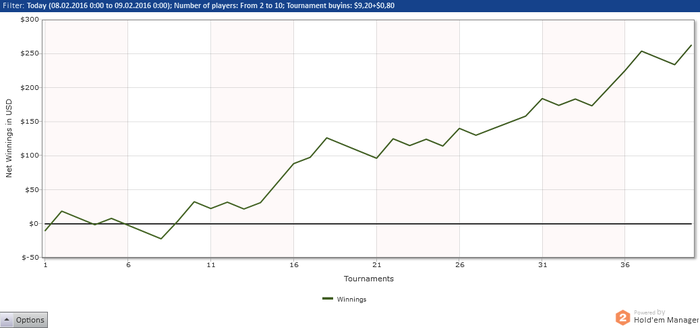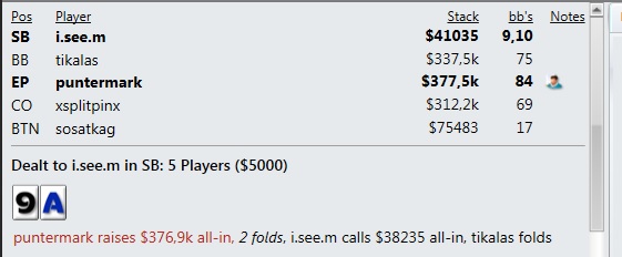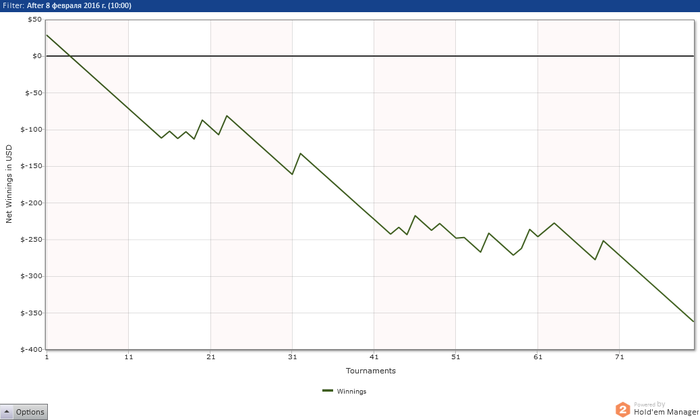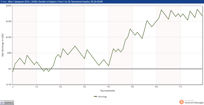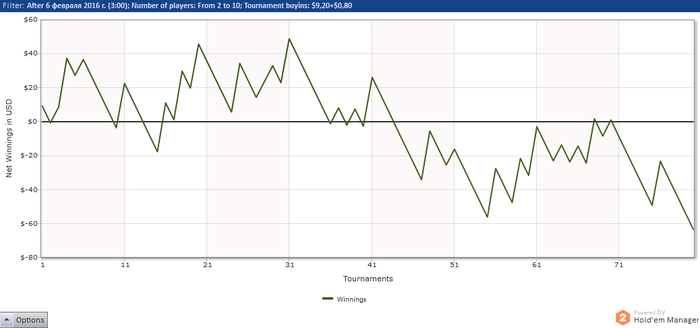 Турнир - сателлит. Первые 10 мест получают приз. Осталось 11 человек. Я - самый короткий. Следующий имеет почти в два раза больше. На моем столе 5 человек(блайнды по нам чаще проходят) + чиплидер на моем столе пушит каждую руку. На втором столе самому короткому, у которого в два раза больше наших фишек, отдают блайнды. Кто за колл +, за фолд -