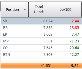 Есть мнение, что для просмотра винрейта\лузрейта на блайндах, нужно хотя бы 250К рук. Просто, к сведению - на выборку в 50К рук у меня были винрейты на блайндах 6бб\100 SB и 1бб\100 BB, на выборку в 150К лузрейты -6бб\100 SB и -25бб\100 BB, на выборку в 250К рук -11бб\100 SB и -30бб\100 BB. Какие будут в 1M рук, я даже боюсь представить. Да, у меня имеются некие проблемы с большим блайндом, но суть в том, что разница, между определённым количеством рук более чем существенная.