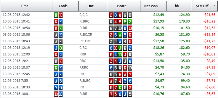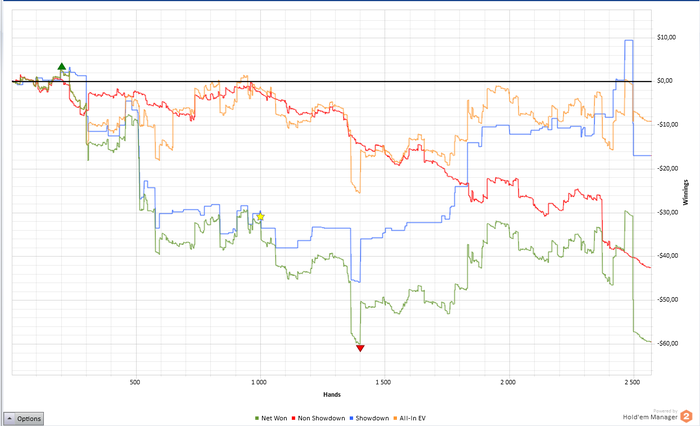 Во первых, она получилась очень ленивой. Я отыграл очень мало рук и впервые за долгое время, практически не работал над игрой. Во вторых, с моей игрой творилось что то не ладное. Мне ужасно не заходило и большинство времени, я просто играл в стул, а когда пытался с него хотя бы приподняться и попробовать продавить оппонентов, меня быстро усаживали на место. Что прекрасно демонстрирует красная линия. Единственной радостью было, что мне очень неплохо удавалось тащить монетки с низу. Отсюда и такой перебор. Но что самое печальное - я все еще не могу осилить нл10. Я не понимаю, почему у меня не получается бить этот лимит. Ведь по сути, он не особо отличается от предыдущего. Но даже закрепиться на нем, пока не удается.