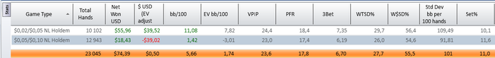 Infusorium, да я прекрасно понимаю, что дистанция не показательна. Я ж чисто по фану запилил его, а не для того чтобы выебнуться как я крут. А вообще все винрейты, что ты написал выше, вроде как заебись. Насколько мне известно, что годными лузрейтами на блайндах, считается -15bb/100 и -35bb/100, хотя MoronMode, вроде где-то писал, что в идеале на длительной дистанции, возможно играть на СБ в плюс.