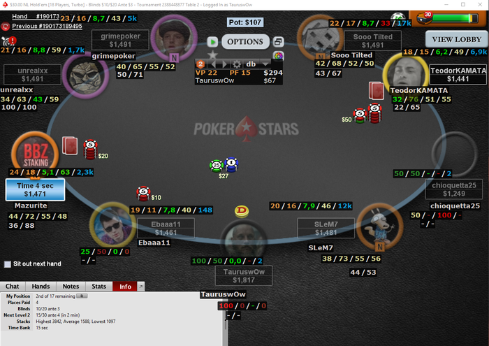 Хорошо вчера покатал, старзы опять что-то не в себе. Шёл всю сессию -500, закончил +400. Блин, хочется и дотку глянуть и в покерок покатать. Раньше как-то удавалось совмещать, а вчера чувствовал, как не хватает скорости принятия решений. С 3макс ATs>Axo>K8o