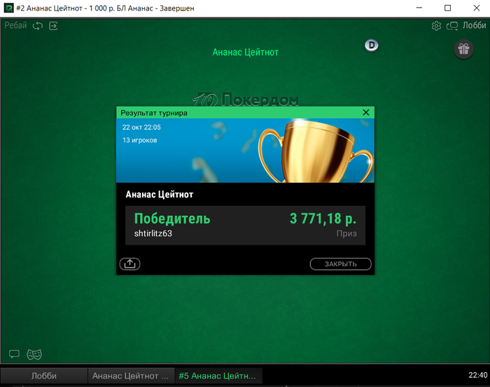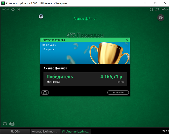 Ну и пока вот этой своей "Задачей" занимался узнал за китайский покер, так называемый "Ананас". Очень уж он меня увлёк, я стал специализироваться именно в этой дисциплине. На свои никогда не играл, так что не подумай, что я могу "проиграть квартиру" или что-то в этом роде. Игра построена на теории вероятности, поэтому постоянно выигрывать не получается. Поэтому, в случае каких-то просадок или, если приходилось выводить деньги из рума "на жизнь", я прибегал к бекингу. Это такая тема, когда один человек (бекер) даёт другому (игроку) деньги на игру. Игрок играет по заранее оговоренным условиям, а прибыль они потом делят. Я так делал 13 раз и всё время "зелёный", т.е. в плюс. Горжусь этим очень и не знаю никого на форуме, у кого было бы так же)) Суммы там небольшие, но тем не менее...