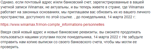 Однако, если почтовый адрес и банковский счет, указанные в вашей учетной записи Winamax, недействительны, и в настоящее время вы живете в стране, где Winamax работает на законных основаниях, пожалуйста, войдите в систему и обновите свою информацию в разделе «Моя учетная запись» до понедельника, 14 марта 2022 года: