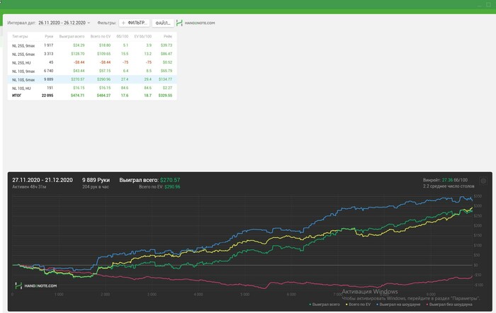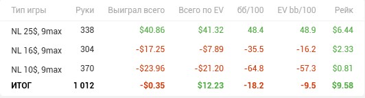 Самое главное, что хотелось бы отметить: достойно выдержал негативный период, тильтовал намного меньше обычного. Миксовал лимиты, и по bb летел -3,5 стека, так как поначалу загрузка была в основном NL10-16, но после 23:00 прям очень сладкие столы NL25 нашел.