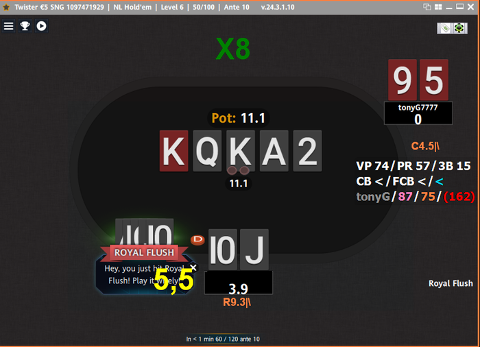 Я как-то прочитал на форуме от рега, сыгравшего хрен знает сколько раздач в онлайне и офлайне, что ему никогда не доводилось собрать флеш-рояль. Уже не помню, кто это был. Мне доводилось собирать его больше одного раза, но вот не помню, два или три.