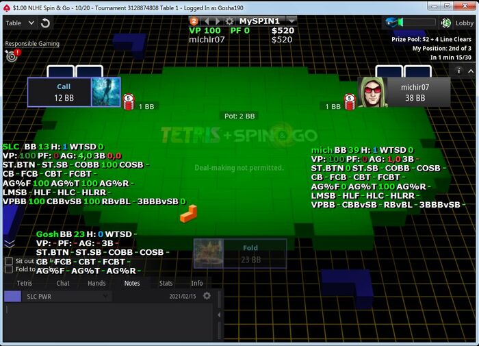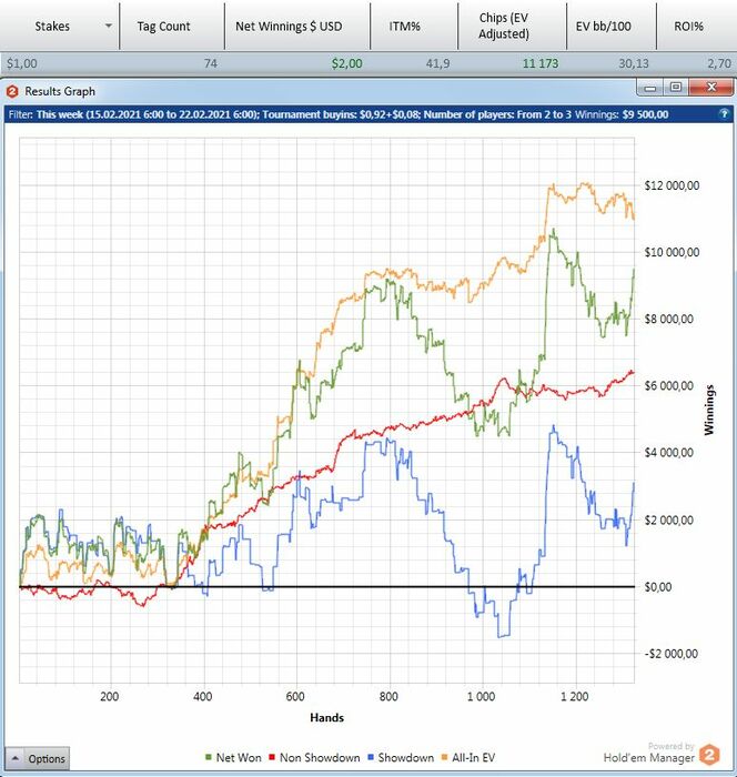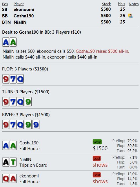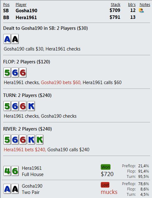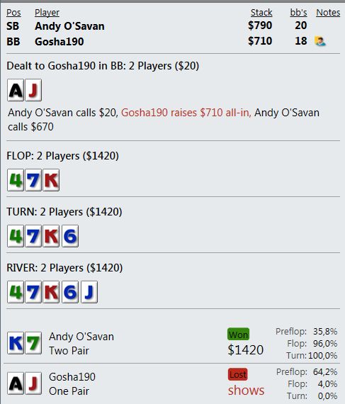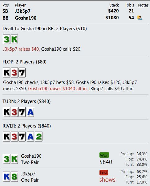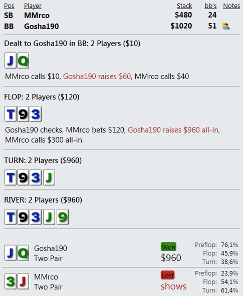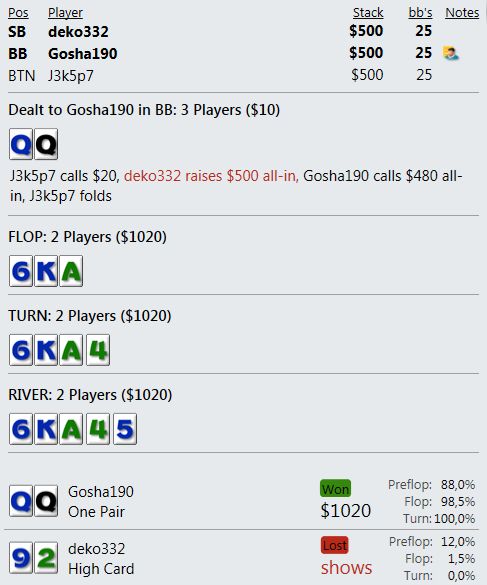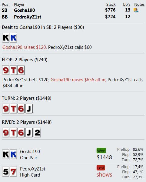 Оппонент на ББ всех этих нюансов, конечно, не понимает и против такого нам не нужно задумываться, как наш спектр выглядит в его глазах. Но все равно, мне кажется, не совсем логичным агитировать оппонента за фолд, аргументируя это наличием у себя тех рук, которых в принципе у нас быть не может.