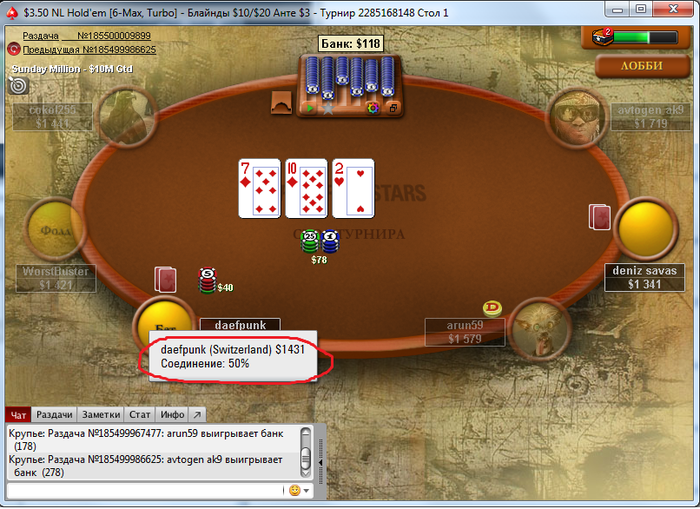 При том сегодня я посмотрел какое соединение у кеш игроков, турниров МТТ и Спин энд го, там у всех игроков 99% или 100%, и только у игроков в турнирах формата Сит энд го соединение 50%. То есть если я играю кеш, МТТ и Спин энд го, то никаких зависаний нет, зависания только в турнирах Сит энд го и то не во всех. Хотел бы узнать у всех так или у меня одного? Даже если вы не играете турниры Сит энд го, вы не могли бы зайти и посмотреть любой турнир Сит энд го 6 макс будет ли там соединение 50% у других игроков или нет?