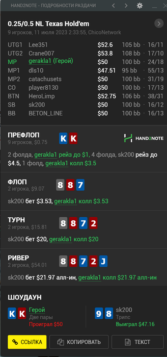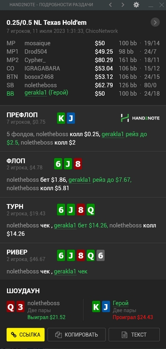 11/07/2023: 5.14ч, 2709 рук nl50 +$62.