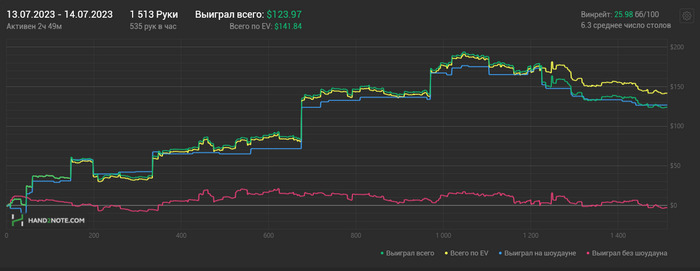 14/07/2023: 2.49ч, 1513 рук nl25/50 +$114.