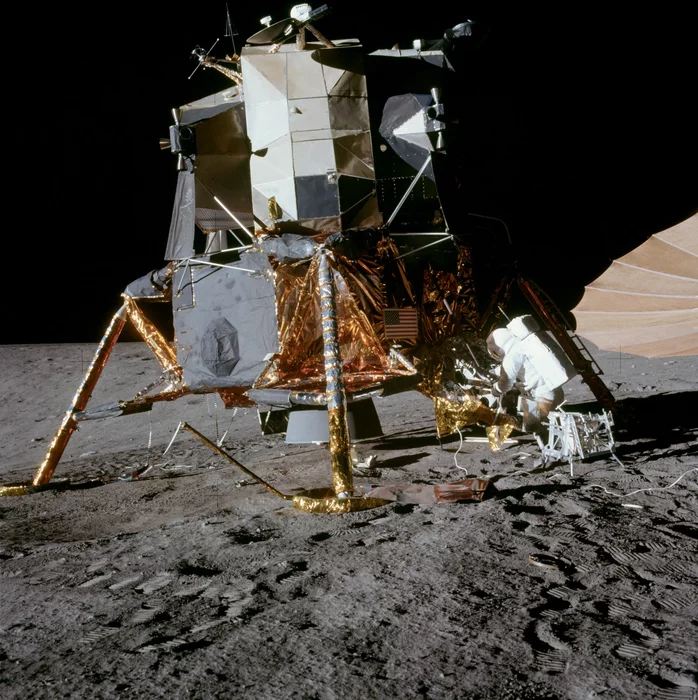 То есть взлетели с Земли, долетели до Луны, там на орбите остался основной корабль с одним астронавтом, двое спустились на такой вот табуретке, обёрнутой фольгой