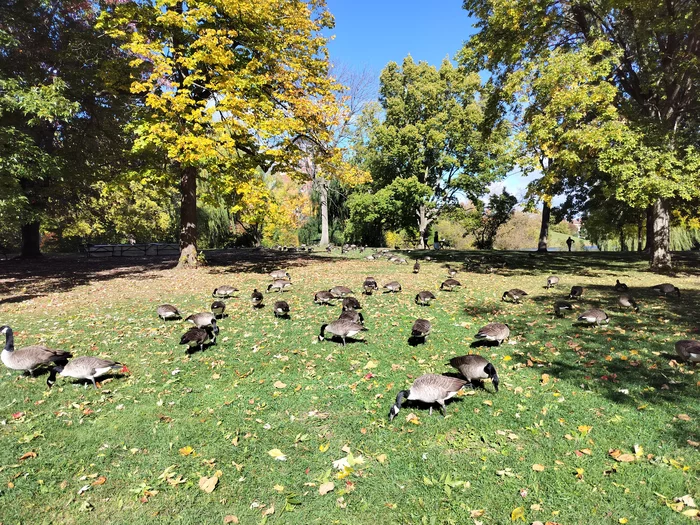 В парке рядом с домом тусит куча гусей.
