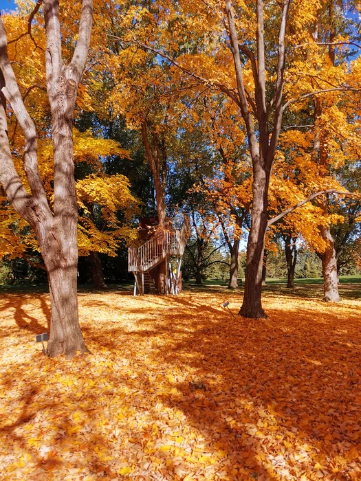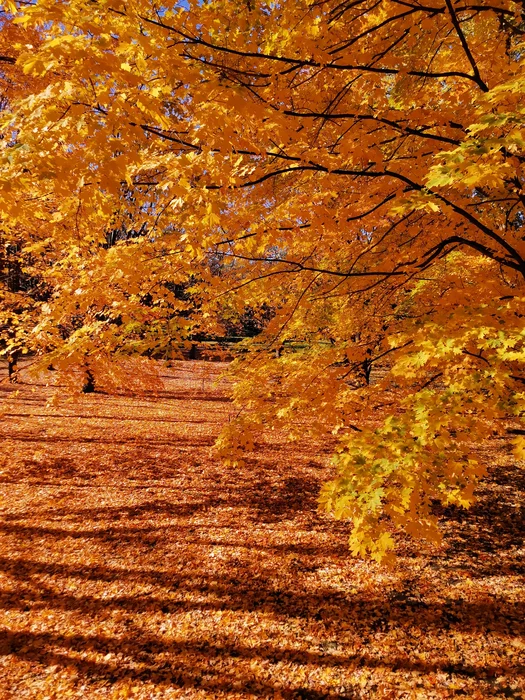 В прошлом году нашли красивое место в ботаническом саду, где растут несколько разных видов кленов. Осенью они все дружно сбрасывают листья, образуя оранжевое пятно и контрастируя с соседними деревьями и зеленым газоном.