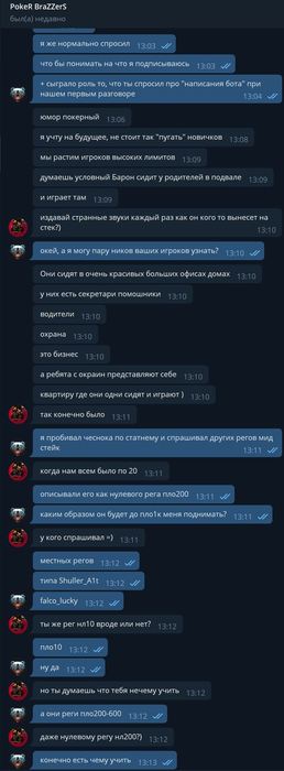 я бы сильно проникся уважением к тому или тем специалистам из СБ рума, кто смог бы эффективно вычислять тех же ботов и подсказчиков. уверен, такие есть у каждого рума, люди, стоящие на защите честности нашей игры, про которых будет небольшая статейка типа "Рум победил N ботов". но если это не мулька, то, наряду с группой людей, вычислявших ботов по отклонению частот в стратегии игроков на выборке, СБ рума респекта заслуживает. Это большая работа, с постоянно усложняющимся соперником и условиями, и, считаю, написать бота по игре намного проще, чем его вычислить.