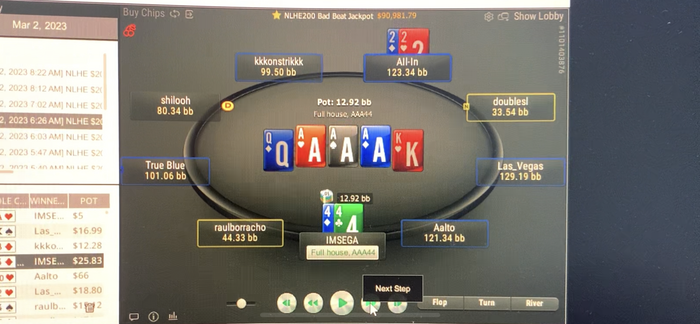 Сыграл сессию часа 2 и лег спать. 2 марта с утра зашел в рум и увидел что на нл100 джек стал 5к, получается он раза 3 выпал за ночь. Смотрю на нл 200 90к$ уже решил играть 6 столов двухсотки, через 3 часа где-то произошла раздача: