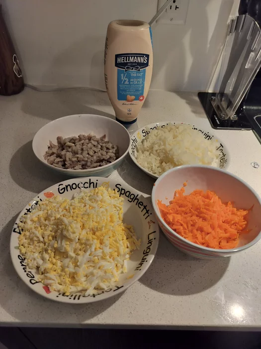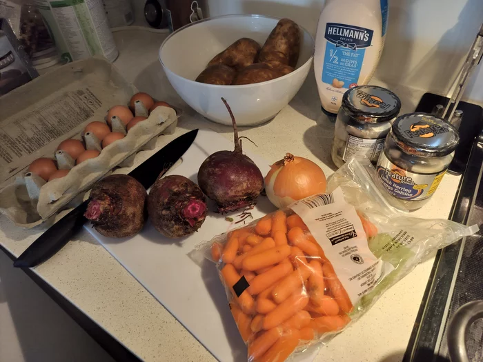 Делал я все это в первый раз, поэтому ингредиенты покупал в рандомном количестве, в итоге получилось на 2 порции. Единственной проблемой оказалась селедка - в магазине нашлась лишь маринованная, хотя рецепт требует соленую. После пары часов варки овощей, чистки сельди от костей и использования терки я стал на шаг ближе к результату.