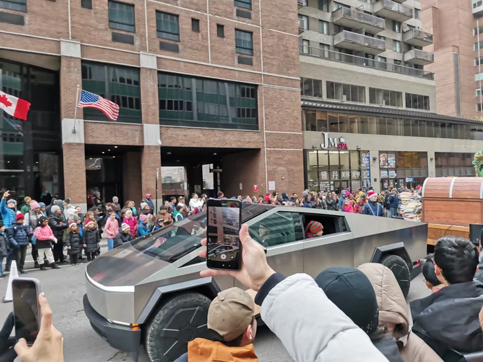 Когда мы подошли ближе, оказалось, что большую часть платформ тащили на себе кибертраки. Впервые увидел их вживую. Я бесконечно далек от знатоков автомобилей и еще дальше - от их дизайна, но кибертрак выглядит, по моему мнению скромного обывателя, круто и футуристично. Потом в инстаграме увидели шутки о том, что это был парад кибертраков