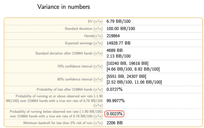 UPD. А еще можно зайти в калькулятор диспы и глянуть там вероятность события при котором у человека N bb/100 недоборо/перебор на M сотен тысяч рук.