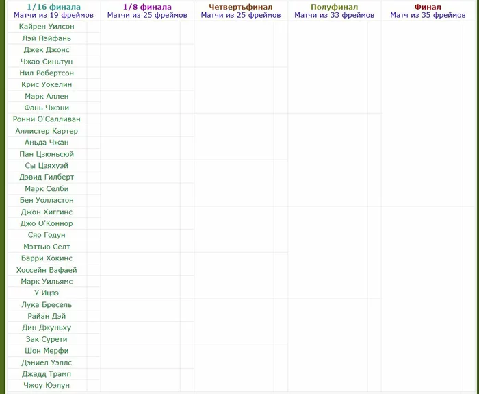 предчувствие, что это тот чемпионат мира, где не будет никаких неожиданностей, такое ощущение, что в четвертьфинал выйдут все топы, кроме Кайрена конечно же, он не пройдет китайцев.
