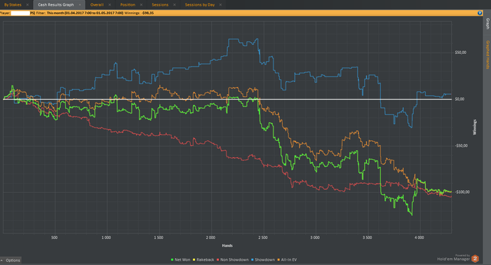 (2 players)Наступаю на одно и тоже. Уже плюс выходил по итогу месяца. Но за один пасхальный день слил снова 10БИ, при этом в одни ворота. Сначало ЕВ шел в минус, а я тащил, а потом во время второй сессии по ЕВ незачительный минус, а по факту проиграл все сравнения 60/40, 70/30, 80/20. Уже до такой степени, что боялся трибетить любых тузов. Самое обидное, что сам же чувствовал, что не надо садится играть, плохо будет.