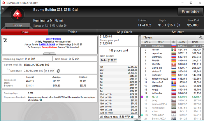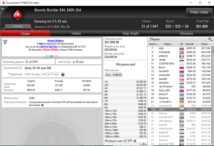 PokerStars - $15+$15+$3|2000/4000 Ante 600 NL - Holdem - 7 playersHand converted by PokerTracker 4UTG+1: 32.41 BB (VPIP: 20.29, PFR: 16.18, 3Bet Preflop: 13.79, Hands: 69)