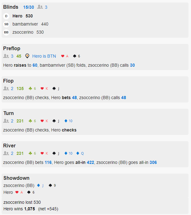 Я планирую курсовую программу для группы учеников в обозримом будущем, но пока не уверен в своем расписании, чтобы форсировать эту тему. Поэтому сейчас интересующимся ребятам я предлагаю начать с проведения полноценного ликфаиндера. Ликфаиндер - это активность на 5ч тренерского времени, половина из которого тратится на анализ видео ученика, его HH, выявление ликов, подготовку примеров раздач на совместный разбор и наработку конкретных игровых рекомендаций, а вторая половина которого - наша непосредственная тренировка, где мы все подробно разбираем и обсуждаем. На выходе у ученика остается заготовленный мной файл с прописанными гайдлайнами и, конечно, запись тренировки. Если такой формат для старта совместной работы вам интересен, пишите в ЛС - обсудим детали. Или можно подождать пока созреет другой продукт