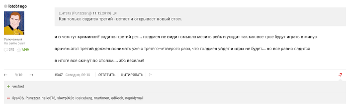 что у меня нет претензий к нему, нет претензий к тому, кто садится в 3макс и играет эти 3-4-5-6 максы потом а не выходит через 1-2 минуты, а играет уже до упора.... по крайней мере до того времени, пока эти 2 рега, к которым он подсаживался еще сидят за столом