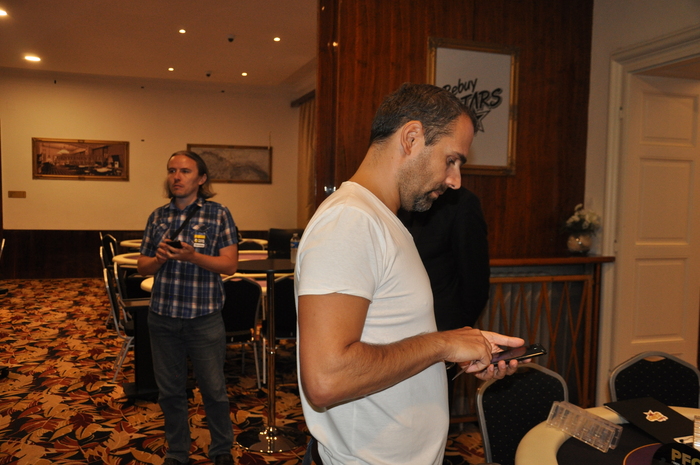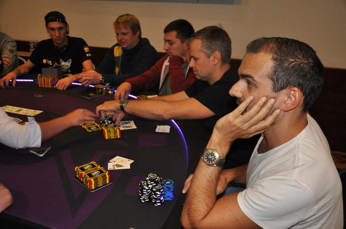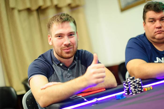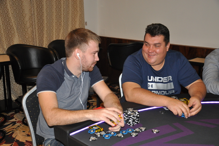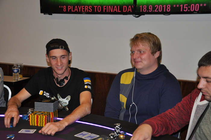 Мик разошелся. Сначала выбил из турнира Мирослава, а потом выиграл большую раздачу у Олега Филатов теперь чип-лидер с небольшим преимуществом над Андреем.