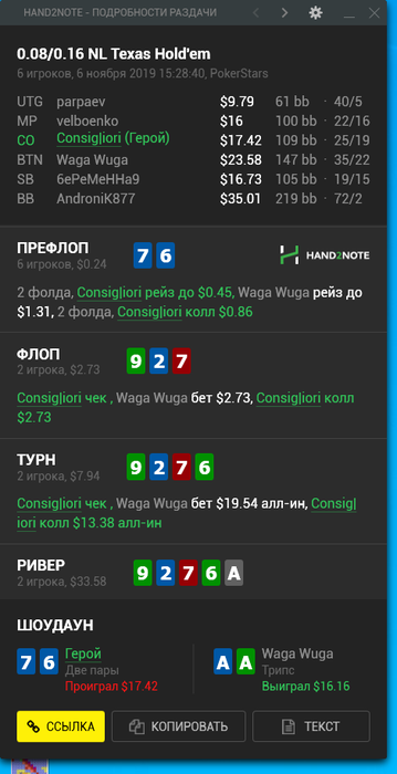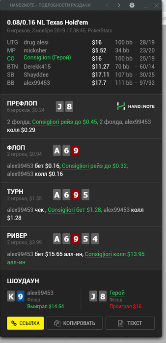 2. Почему на ривере мы смотрим на его впип/пфр, когда он пушит? Эти статы нам даны для определения его спектра. Действия же на ривере относятся к статам агрессии. Там надо смотреть на агрессию по улицам и втсд/ввсф/воншд. Если они зашкаливают и мы видим что опп агро, то можно склониться к колу. А если эти статы "спокойные", то тут не очень сложный фолд, старше нас куча рук Кх, Дх пиковых.