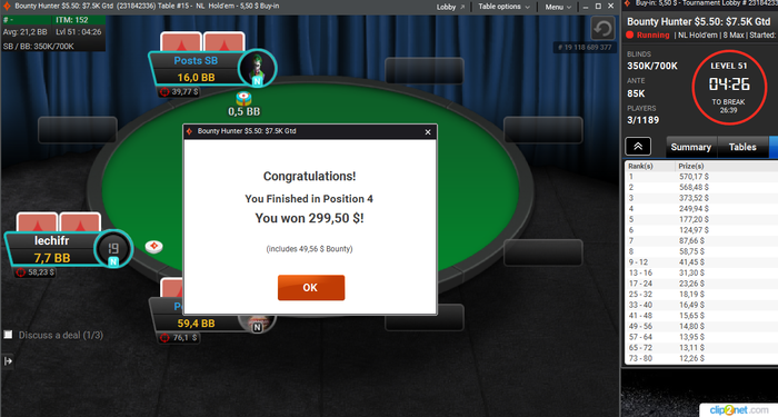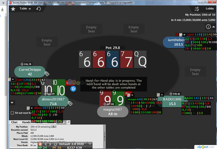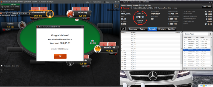 Дополз до финалки в турбо хантере 22 на пати, признаюсь тяжело играть против полного стола регов аби 10-50. В итоге просто пихнули. Благодаря этой финалке неделя вышла не в минус. В целом покерная неделя ужасная. Играл отвратительно. Возьму 2-3 дня перерыв в практике и займусь теорией плотнее, заодно и голову остужу. Отыграл сегодня турниров: 42 АБИ: 14$ Результат: +267$